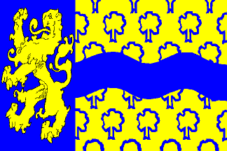 a blue hoist charged with a yellow lion rampant and a fly of three horizontal
