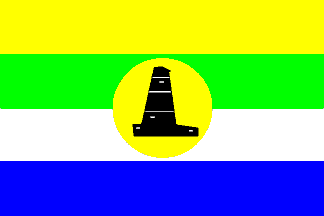 Flagdescription: four equally wide horizontal stripes yellow - green - white - blue, with in the center a yellow disk, high 9/20 of flagheight, and on the disk a black salt-derrick.