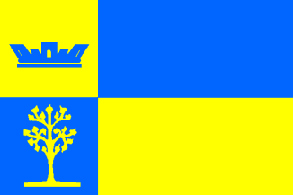 with on yellow a stylized blue city-crown, and on blue a yellow stylized