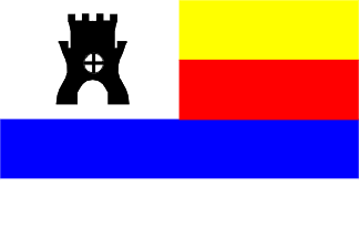 red - blue - white, with a white canton charged with a black burgh.