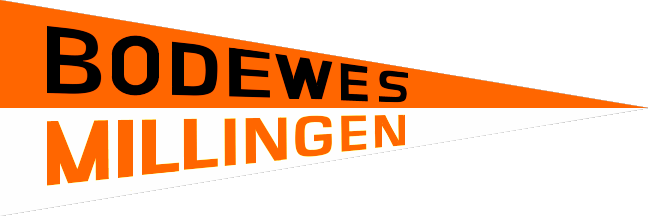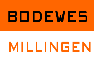 This website presents a number of interesting, even beautiful flags of various kinds (flown or shown at a German inland vessel’s blessing), but for the moment I am only concerned with above firm. Please click ‘Schiffstaufe’ at top of page: this leads to a page of clickable photos. The Bodewes (Millingen) house flag is the one with orange and white stripes in row 1 (5th pic) and row 4 (2nd pic and last three). It is horizontally divided orange above white, ‘BODEWES’ in black letters on upper stripe, ‘MILLINGEN’ in orange letters on lower stripe. No serifs.