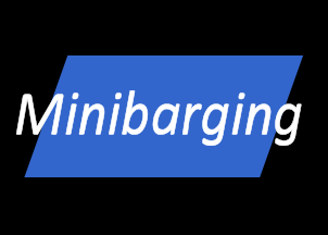 field with blue right-leaning parallelogram, white name ‘Minibarging’ (italic,