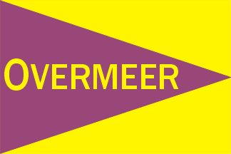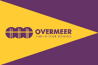 Flag found at http://www.overmeer.com/Modem/TaalkeuzeModem.htm (changed since then, see below), and photos showing the flag flying on the Amsterdam office and a tugboat, respectively on this one: Yellow field with purple wedge or triangle based on the hoist and extending all the way to the fly; on the triangle OVERMEER in yellow letters without serifs and the O somewhat larger.