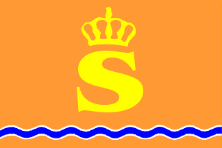 - orange flag; in top a white crown; in center white "S"; in bottom a wavy