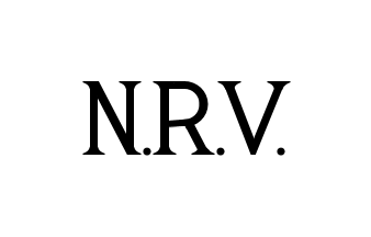 vertically placed initials “NRV” in blue. Fimbriation occurs