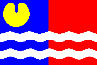 wavy horizontal stripes; in hoist top in blue a yellow waterlily-leaf