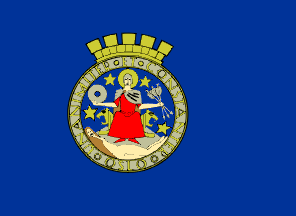 Oslo started using a new city flag in 2002. The flag shows the city's arms, featuring the Holy Hallvard, against a blue background. The decision to change the flag from the simple blue and white striped flag, used since 1924 (see below), was taken by the municipal council in January 2000. It was then suggested that Oslo would try to have the flag officially approved by Royal resolution, a rather optimistic idea as the flag contravenes every heraldic principle enforced by the National Archives for about 70 years. And indeed, it seems the city authorities never even bothered to apply for approval, preferring instead to go ahead using the flag, and this is what has now happened. Against a threat of fines or prison terms up to three months, a law from 1933 prohibits Norwegian municipalities from flying any other flags than the national flag or those civic flags approved by Royal resolution. This seems to concern no one, least of all the country's capital.