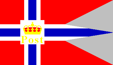 The flag is tongued, with a white square on the intersection of the cross, with yellow letters 'Post' surmounted by a crown.