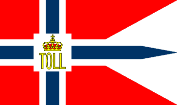 The flag of the customs services is a tongued flag, with a white square on the intersection of the cross, with yellow letters 'Toll' surmounted by a crown.
