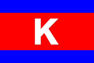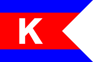 Maritime timetable images shoe Klaveness Line (A.F. Klaveness & Co. A/S, Oslo) having red swallowtail with broad blue horizontal edges, a large white letter `K' in the middle.