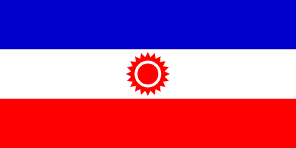 Horizontally divided blue over white over red, in centre a red 20-pointed sun, with a white ring inside the points.