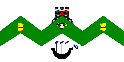 Argent, on a Fess dancettee Vert, between in chief a Castle triple-towered
