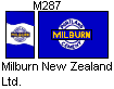 Milburn New Zealand Ltd, Cement makers with origins back to Milburn Lime & Cement Co. Ltd. formed in 1888 which merged in 1963 with New Zealand Cement Holdings Ltd. to form New Zealand Cement Holdings Ltd. which changed its name in 1988 to Milburn New Zealand Ltd. From 1967 they operated their own ships for coastal transhipment and as Milburn New Zealand Ltd. flew a blue flag with a white annulet enclosing a white centre but broken by a horizontal band of the field which was edged black to form a panel on which was shown the yellow legend "MILBURN" whilst the annulet bore the blue inscription of "PORTLAND" [upper arc] and "CEMENT" [lower arc] being shown by The Log 11/1994. In 2002 it became Holcim (New Zealand) Ltd. as part of the international group which had controlled the company since 1977. No flag has been seen being flown by the ships since.