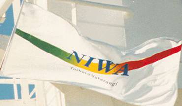 National Institute of Water Atmospheric Research. A Crown research company set up in 1992 as a stand alone company. In 1996 it took over the vessels of the Ministry of Agriculture & Fisheries operating them through NIWA Vessel Management Ltd. The logo is best explained by visual methods with a rainbow format and dark blue lettering including the Maori version of the name and which is placed on the white superstructure but with the small lettering being in black and slightly slanted but not as much as the larger dark blue "NIWA".