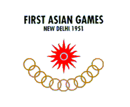 In the 1940's Guru Dutt Sondhi, IOC member for India, proposed an Olympic-style competition among the nations of India. In response the Asian Games Federation (AGF) was created on Feburary 13, 1949. The AGF adopted a symbol consisting of a red sun. Below the sun was an arc of interlocking rings. The number of rings was equal to the number of member nations of AGF. Thus there were 11 rings in the original logo. As each member was added over the years the number of rings grew, too. This flag of the AGF consisted of this logo on a white field. This same flag, with an ever growing number of rings, served as the ceremonial flag of the games from 1951-1982. I've seen a photo in the January 1983 issue of Olympic Review that seems to show the games motto "EVER ONWARD" in an arc above the sun on the ceremonial flag. This suggests the motto may have been added to the logo and flag at some point.