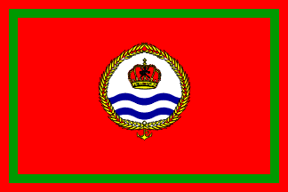 Commander in Chief of the Navy (the Sultan): 2:3 red flag with green inner border and an emblem in the centre. The emblem is a white disk with two wavy blue stripes in its base and the Omani crown above them, all encircled within a golden wreath with an anchor in the bottom. The leaves seem to be different from those used in other Omani flags (naval, police), but my drawing is merly schematic for the time being.