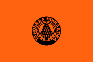 The official flag of Tahoeraa Huiraatira is horizontally divided orange-white-orange (1:2:1) with the party emblem in the middle. The similarity of this flag with the flag of French Polynesia is of course not coincidental.