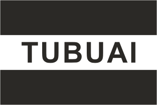 The flag of Tubuai, as seen during the opening ceremony of the Inter-Austral Island Games in 2000, is horizontally divided black-white-black with the name of the island written in black capital letters in the white stripe.