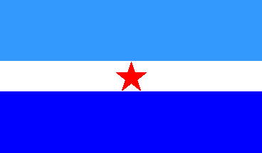 -- The red star singles out Makatea within the Tuamotu Archipelago, with its 16 blue-starred flag, and is a 'rocky' allusion to the symbolism of the middle stripe, uniting sky and sea and completing a red-white-blue reference to the French flag.