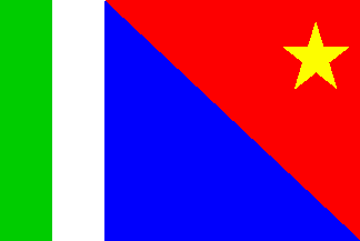 Ratio 2:3. Two vertical stripes, green and white, respectively, at hoist (about 1/7 of the fly width each), then diagonally divided (NW-SE) blue-red, with a golden star in upper fly. Source: Flags of Paradise 1996 chart.