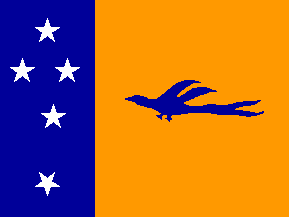 The Southern Cross (a guide to seafarers and indicator of the seasons) is shown over a blue background for the sea. A silhouette of a paradise drongo (a bird found only in New Ireland) is shown on an orange background.