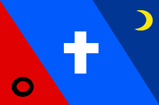 Flag of the Mindanao Independence Movement: vertically divided red-white-yellow, with thin red and yellow stripes. In the center, yellow star and crescent flanked by Arabic (?) script. Source: Flags of Aspirant Peoples.