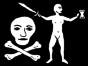 A black flag, in white: a skull and crossbones towards the hoist and towards the fly, a naked man holding an hourglass in his left hand and a sabre in his right.