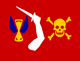 The only one with a non-black background: a dark red flag with a golden hourglass winged in blue (nice way to say that the victim's time of living is flying away!) in the hoist, a white arm holding a sword (or a dagger, judging by it's size) in the center and a golden skull & bones in the fly.