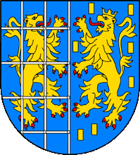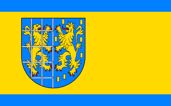 The flag is divided, horizontally blue-yellow-blue (1:7:1) with CoA of