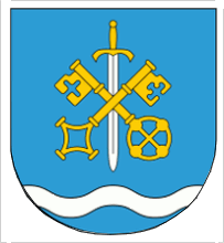 "Arms: on a blue shield and above a silver, wavy ribbon a silver sword