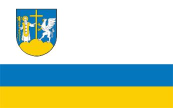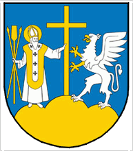 Arms: on the blue shield and on the golden triple hill an image of Saint Adalbert holding two spears and a paddle (he traveled by boat to Prusia and was speared to death by the pagans) touching the golden cross. Also a silver griffin, which is a symbol of the Order of the Sisters of St.Norbert (Ordo Premonstratensis - Opraem), long-term owners of the area.