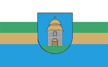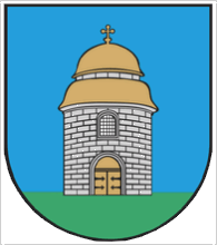"Arms: based on earlier seals and Arms and after few minor modifications, the present Arms show on the blue shield and standing on green grass a silver brick chapel with the golden dome and gate.