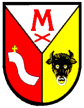 (white) wedge with the red initial "M" above a St.Andrew's cross, also