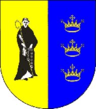 Coat of Arms: per pale azure three crown or, placed 1,1,1; or a monk clad noir