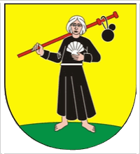 "Arms: on the golden shield a pilgrim dressed in black robe, standing
