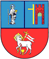 On the lower, red field there is the white Lamb of God (Agnus Dei)