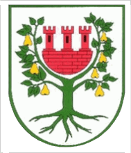 "Arms: on a silver (white) shield a green pear tree with seven gold
