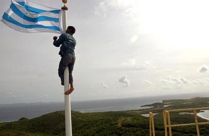 also known as 'Tito Kayak,' unfurls the Vieques flag that he