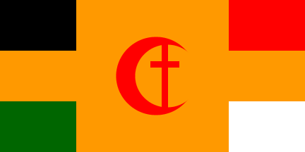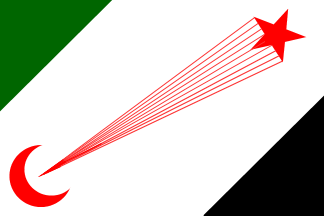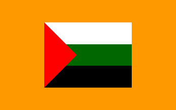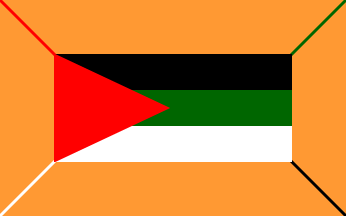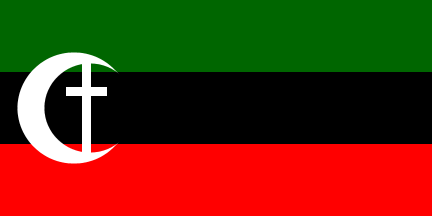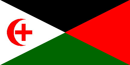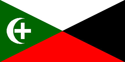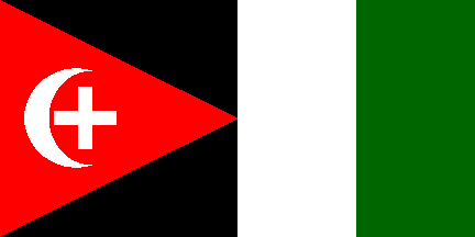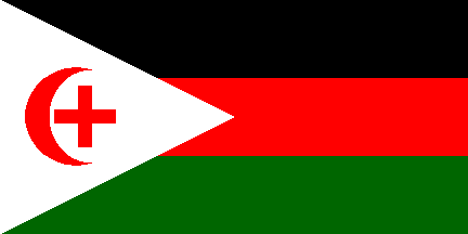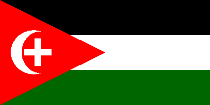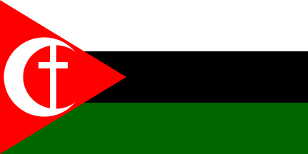 1:2An upside-down Arab Revolt flag with a white device in the triangle, consisting of a Latin cross within a crescent. Reminiscent of flags used by Palestinian paramilitary groups of the late 30's.