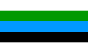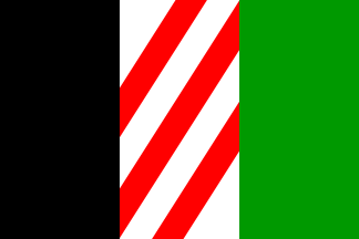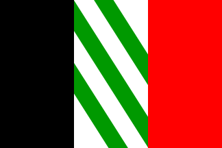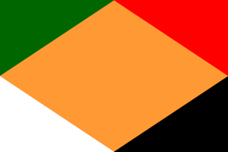 1:2A golden cross of unusual shape, with each quarter of the field a different color: red-white-green-black (clockwise). The cross' horizontal arm is 1/3 the height and its vertical arm 1/2 the lenght of the flag, an uncommon design (occasionally found among Slovenian municipal flags; see for example Ormož, Muta). In the center, a red device consisting of a Latin cross within a crescent (see also below).