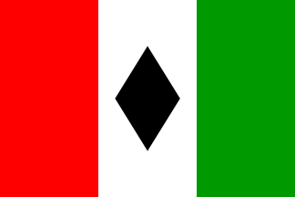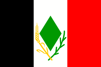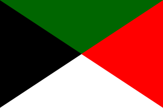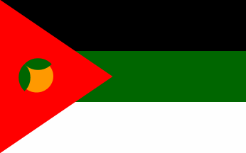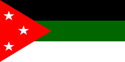 1:2A horizontal tricolor of black-green-white with a red triangle at the hoist (the flag of the Great Arab Revolt), but here defaced with three white stars in the triangle. Compare to the 1920-1924 flag of Iraq, or the 1915-1921 flag of the Hejaz. The meaning of the stars is unknown; three stars arranged within a single crescent on the flag of the Kingdom of Egypt (1922-1952) stood for Muslims, Christian, and Jewish citizens of Egypt.