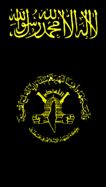 The flag of the Palestinian Islamic Jihad is a Vertical black flag with the Shahada and the Islamic Jihad's CoA (both in yellow outline and lettering).