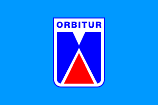 The Orbitur company flag is light blue with the logo centered on it (about 1/3rd of the width and 2/3rds of the height), surrounded by a narrow blue stripe. The logo shows a red triangle pointing upwards notched in a (dark) blue area with a triangular gap pointing downwards and almost meeting the red traingle’s top. All this in a white very stylized shield (a rectangle with its bottom corner slightly rounded) on whose “chief” the lettering "ORBITUR" is set in heavy sans-serif blue capitals. The red triangle seems to symbolize a camping tent. The reverse of the hoisted flag, as usual for such flag, is unreadable ("ЯUTIƐЯO").António Martins, 18 Dec 2005