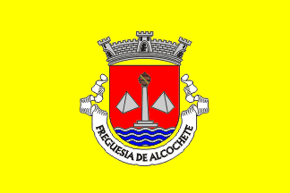 The arms are Gules issuant from a base wavy Argent chared with three barrulets wavy Azure a pillory Argent topped with an armillary sphere Or and between two salt pyramids Argent. Mural crown argent with three visible towers (commune rank) and white scroll reading in black upper case letters "Freguesia de Alcochete". Original blazon: