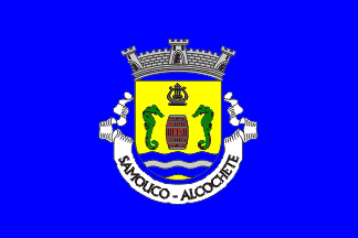 The arms are Or a barrel Gules ringed Argend between two seahorses Vert respectant and in chief a lire Purpure and in campaign a fess wavy Azure charged with a fess wavy Argent. Mural crown argent with three visible towers (commune rank) and white scroll reading in black upper case letters "Samouco — Alcochete". Original blazon: