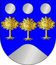 The arms are Azure three trees eradicated Or set in fess, in chief three plates, in base a mound issuant Argent. Mural crown Argent with three visible towers (village rank) and white scroll reading in black upper case letters "GRADIZ".