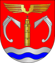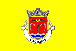 The arms are Gules a lighthouse Or masoned Sable between two hand adzes Argent and in chief a vol Or and on a base wavy Argent a fess Azure wavy. Mural crown argent with three visible towers (commune rank) and white scroll reading in black upper case letters "Cacilhas". Original blazon:
