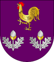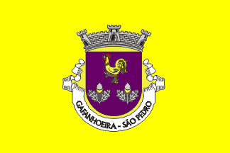 The arms are Purpure a rooster Or crested and barbed Gules and two cork oak twigs Argent acorned Argent capsuled Or, all set in chevron. Mural crown Argent with three visible towers (village rank) and white scroll "GAFANHOEIRA - SÃO PEDRO" reading in black upper case letters.