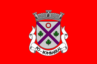 The arms are Argent, divided by a saltire Purpure flanked by three grapes leaves vert and one annulet Gules in chief quarter. Mural crown Argent with three visible towers (village rank) and white scroll reading "PÓ - BOMBARRAL" in black upper case letters.