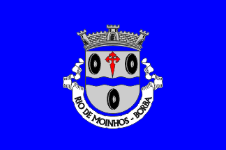 The arms are Argent divided by a fess Azure wavy, in central chief a cross Gules fleury fitchy flanked by two millstones Sable, in base another millstone Sable. Mural crown with three visible towers (village rank) and white scroll reading "RIO DE MOINHOS - BORBA" in black upper case letters.